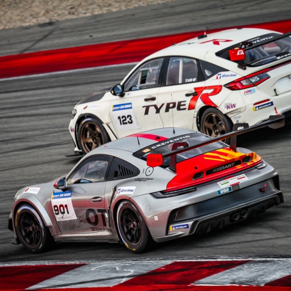 Kevin Clarke led from pole in TCE-TCX for J-Mec Engineering, but the BMW M3 (E46) was soon passed by the No.111 AsBest Racing Porsche 718 Cayman GT4 CS (982) which, in the hands of Conrad Tox Leveau, showed terrific pace. At the 45-minute mark, though, a brake line problem sent Leveau into the gravel at Turn 11 and caused the first Code 60, Clarke retaking the lead.