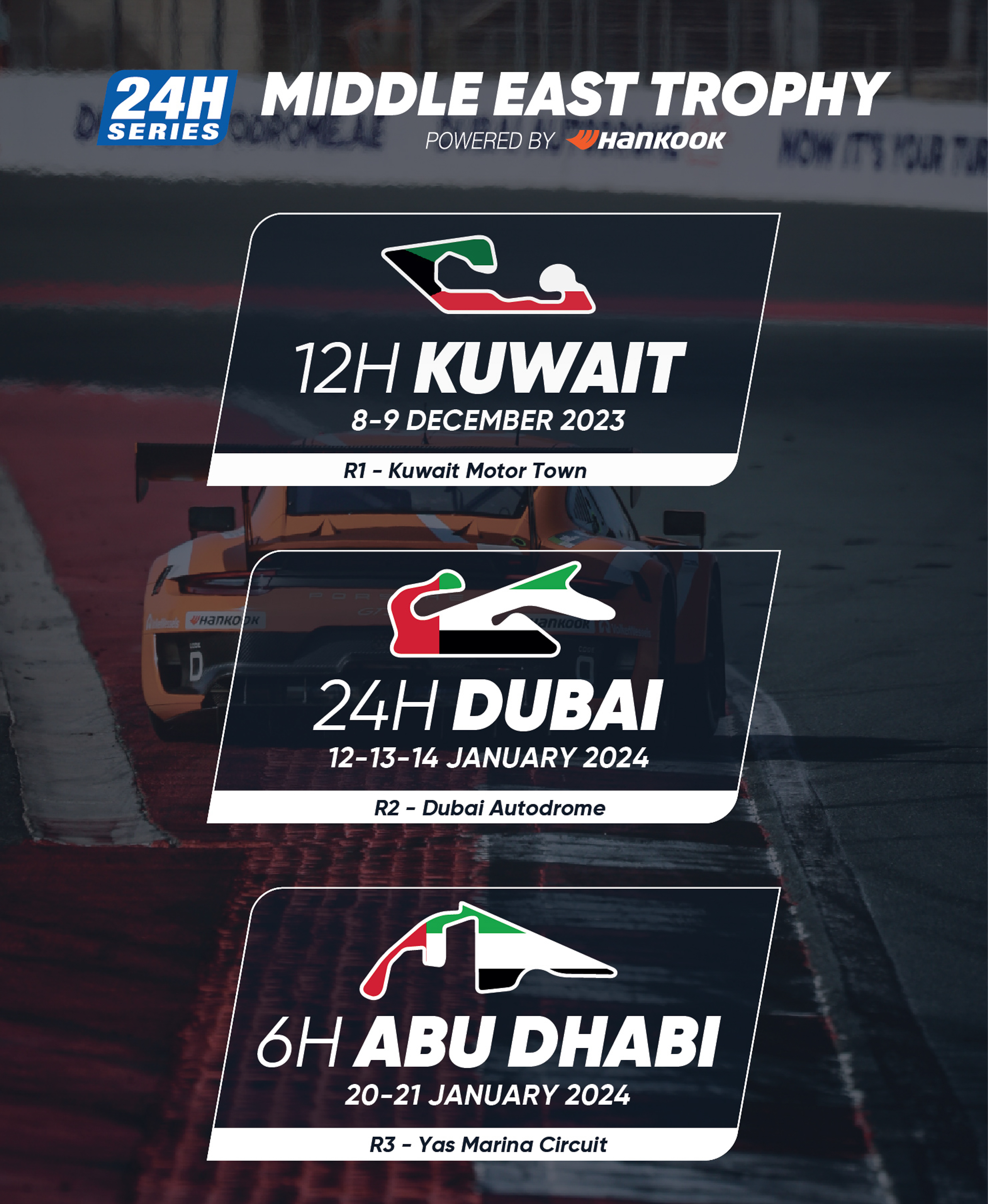 CREVENTIC’s established scoring system will continue to be used for the Middle East Trophy in 2023/2024, with 40 points being awarded to class winners at all three events, 36 to 2nd place and 32 to 3rd. As in 2023, points will not be allocated at half-distance during the Hankook 24H DUBAI.