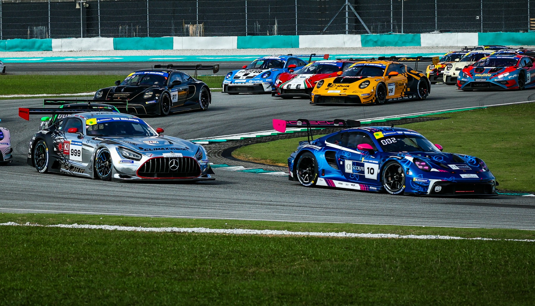 Climax Racing’s Tanart Sathienthirakul launched well from pole position in the No.99 Mercedes-AMG GT3 EVO, although not quite as well as fellow front-row starter Hartog in the No.10 Porsche. Looking outside at Turn One, Hartog positioned his car perfectly for the inside at Turn Two to get the lead.
