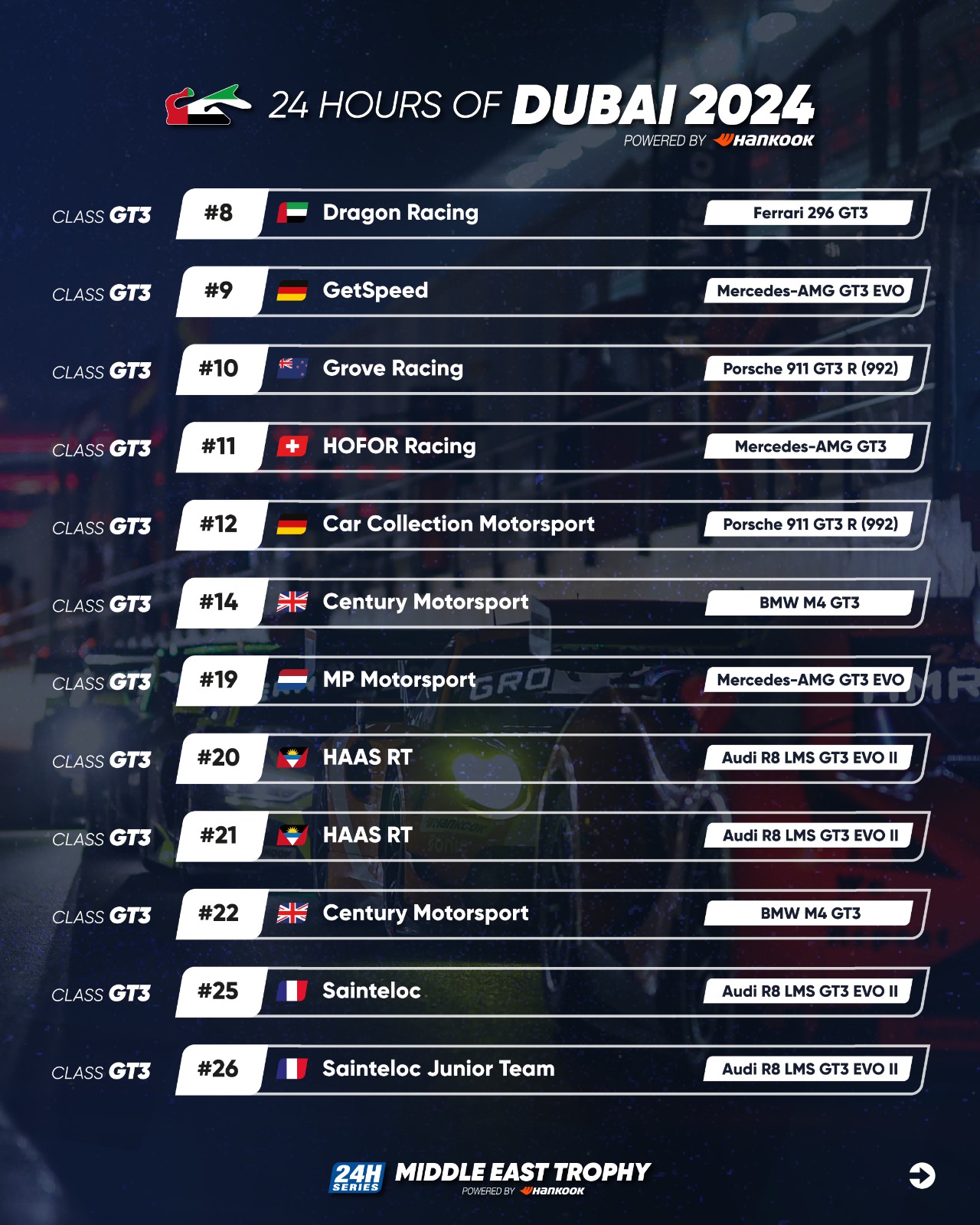 · Three former Hankook 24H DUBAI race winners on the 2024 grid.